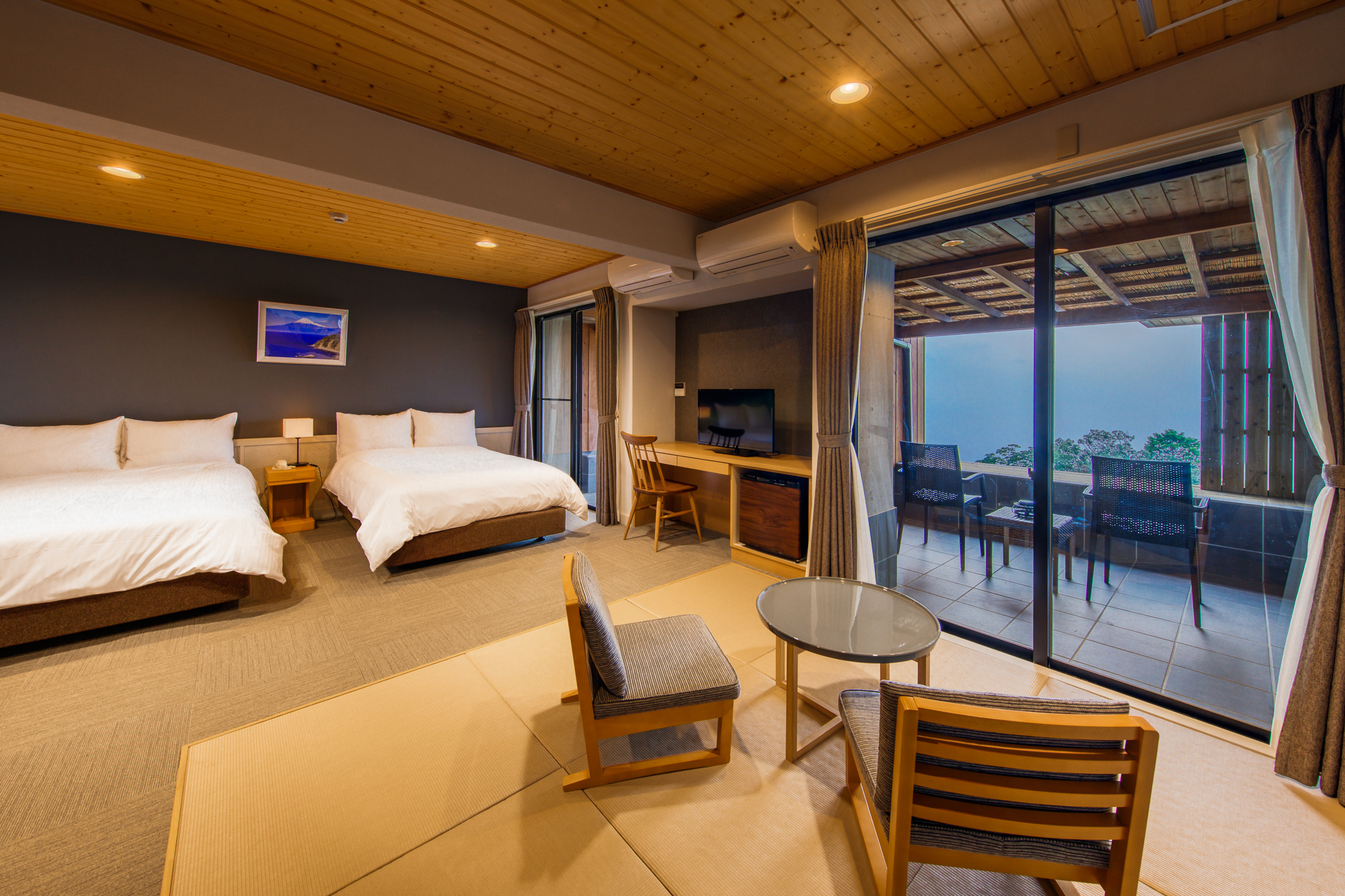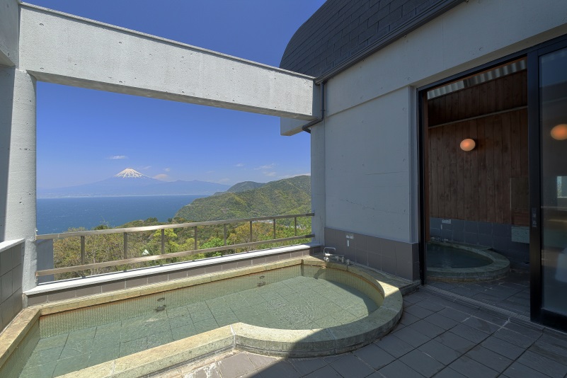 - 海越しの富士山を眺めながら客室露天風呂に浸かることができる。