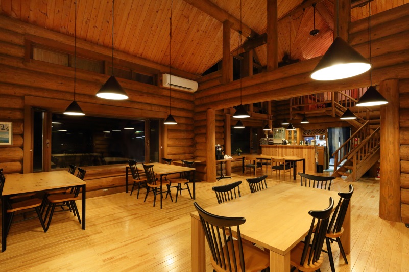 ログハウスに挟まれた真ん中のかまぼこ型の屋根は、1階に大浴場があり、階段を降りると横に一列に客室が並んでいます。